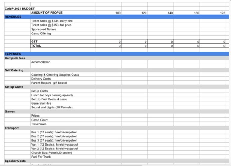 Free Editable Youth Camp Budget Template