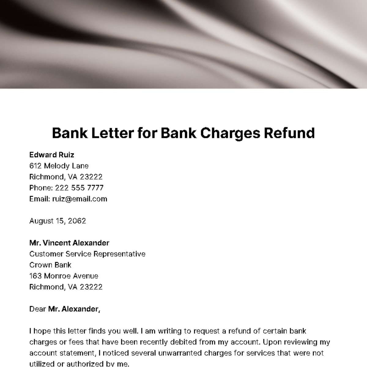 This ready-to-use resource empowers you to articulate your concerns effectively, ensuring that your request for a refund is taken seriously by your financial institution. Ultimately, using a bank charges refund letter template is about equipping yourself with a polished, authoritative voice in your financial dealings, making it an indispensable tool for anyone seeking to rectify unwarranted bank fees efficiently and successfully.
