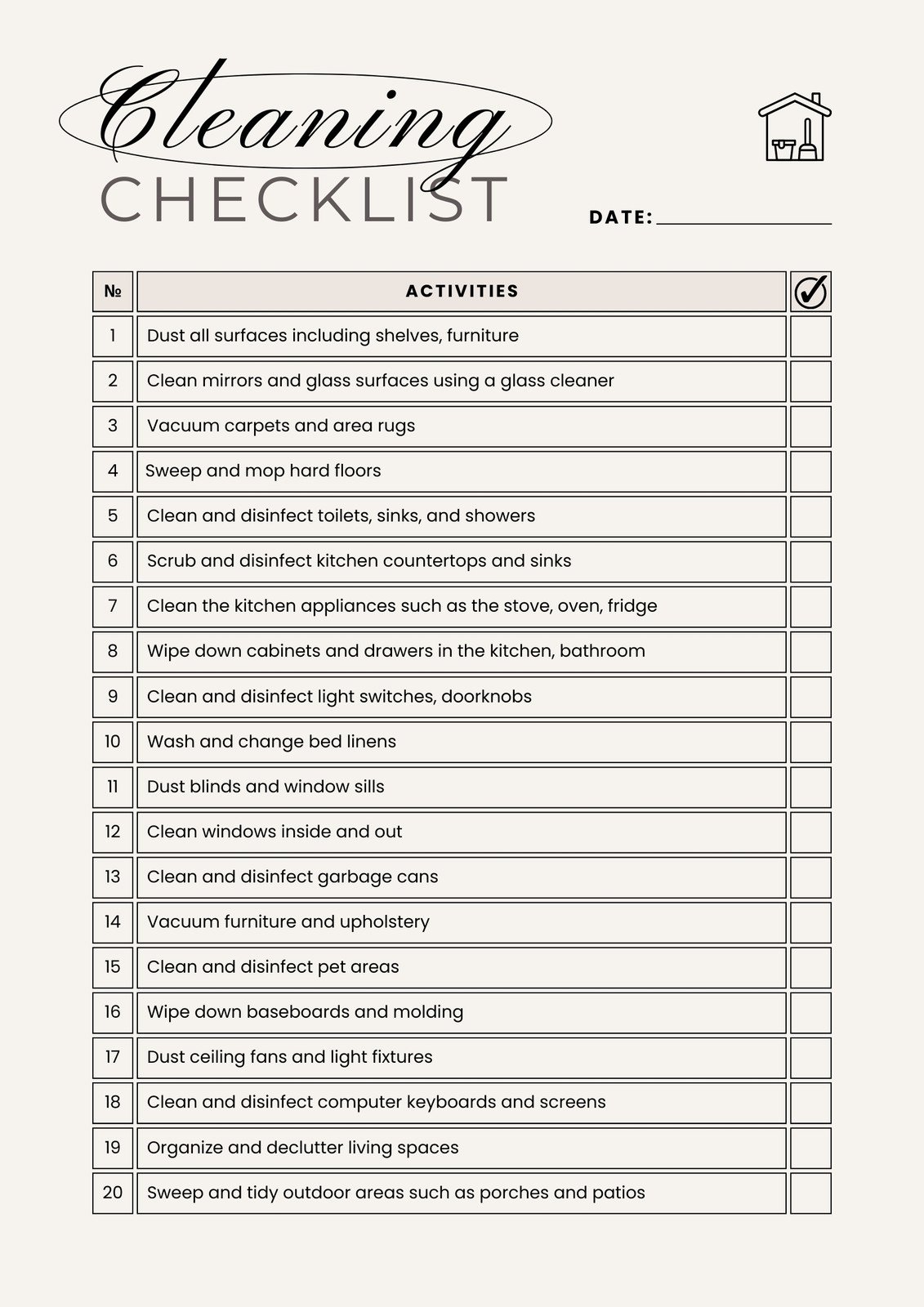 - Areas/Rooms: Clearly delineate the different sections of the space to be cleaned (e.g., Kitchen, Master Bathroom, Living Room, Hallway, etc.). This provides a logical flow and prevents missed zones.
