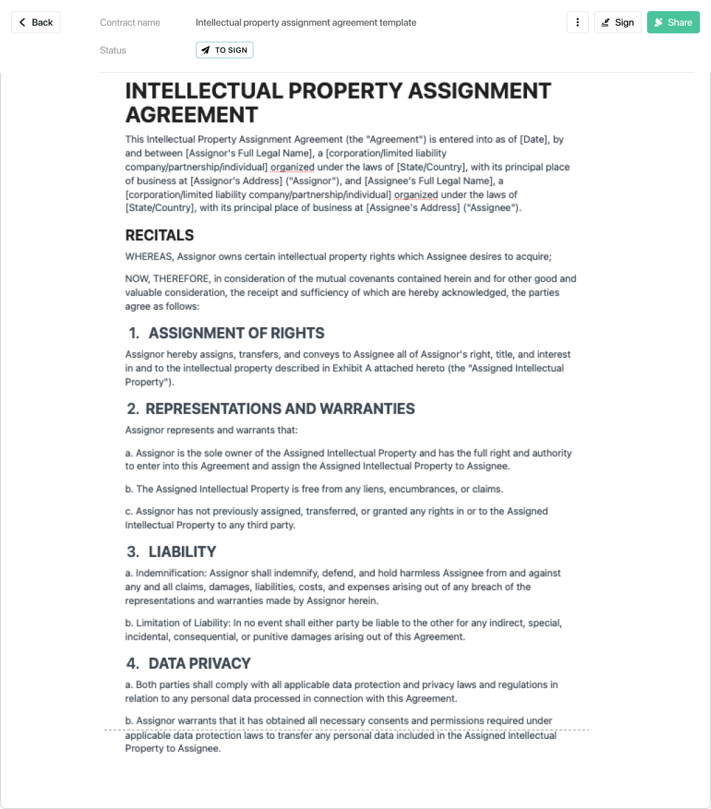 Every comprehensive intellectual property assignment agreement template should include several critical clauses to ensure a legally sound and enforceable transfer of rights. These sections define the parties, the scope of the assignment, the consideration, and the responsibilities of each party. Key components typically include: