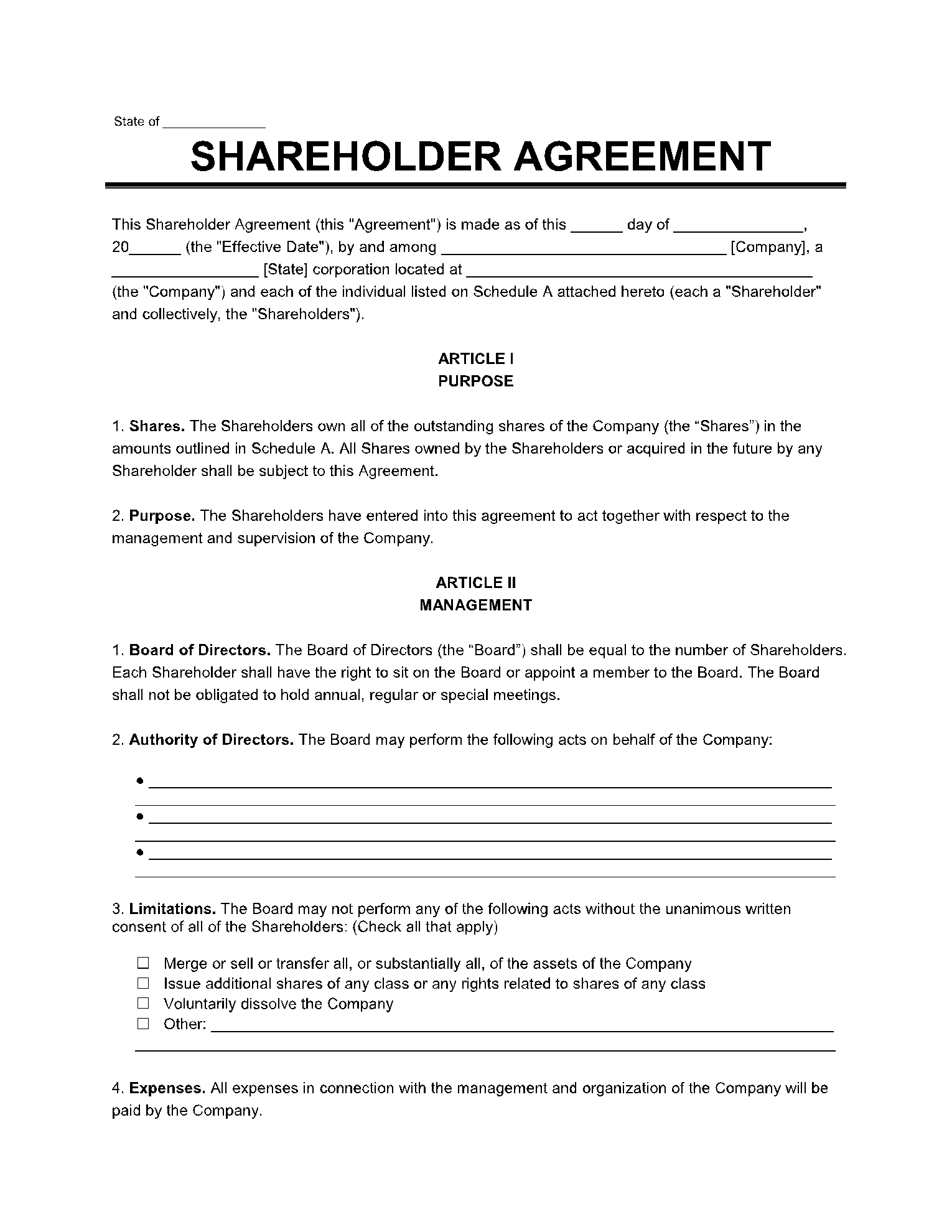 - Board Representation: Specifies the composition of the board of directors, including any rights for minority shareholders to appoint or nominate directors.