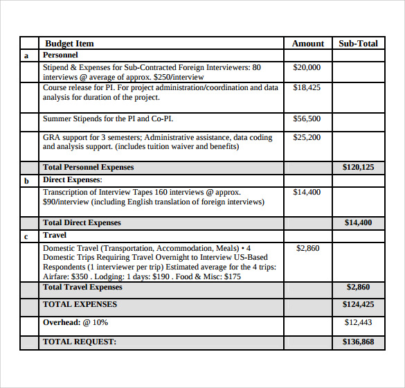 - Other Direct Costs: A catch-all for direct expenses not fitting into the above categories, such as printing, postage, communication costs, facility rental, or publication fees. Each item should be clearly defined and justified.