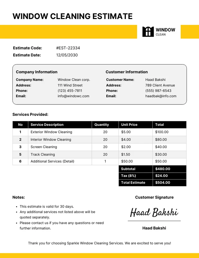 - Service Breakdown: A detailed list of all services to be provided, clearly itemized. For window cleaning, this might include exterior windows, interior windows, screen cleaning, track cleaning, specific pane counts, and difficulty factors.